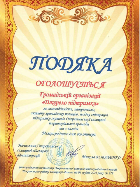 Ми вже ділилися ранковими емоціями, а зараз отримали ще одну важливу подяку — цього разу від Очеретинська селищна військово-цивільна адміністрація Донецької області.